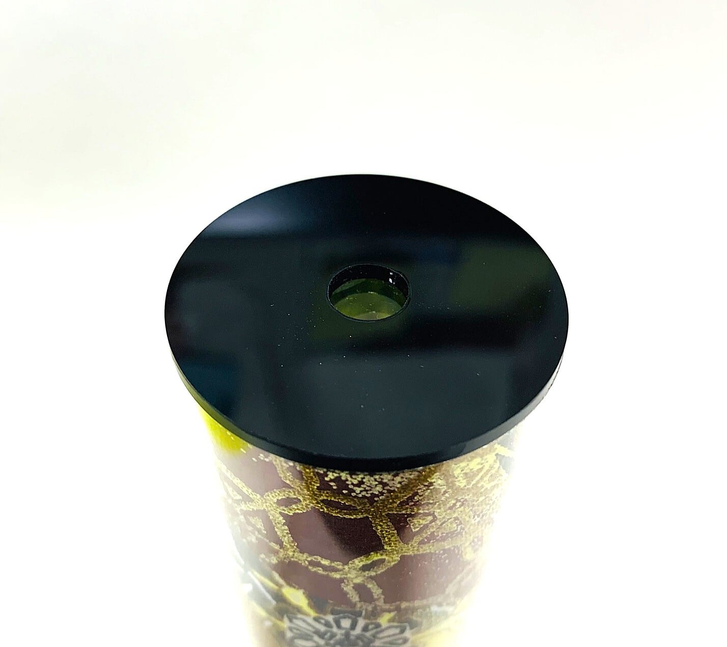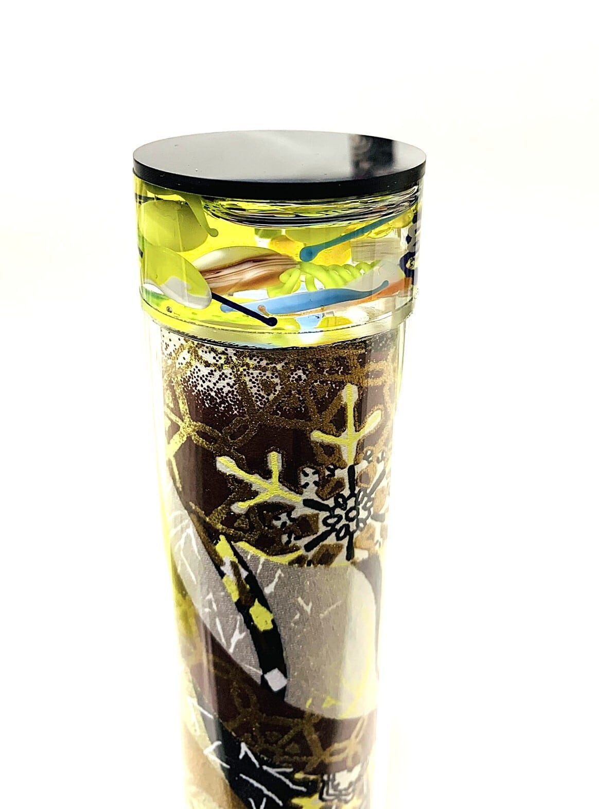 筒部分には透明なアクリル板の下に黄色、茶色、黒を基調とした和紙が