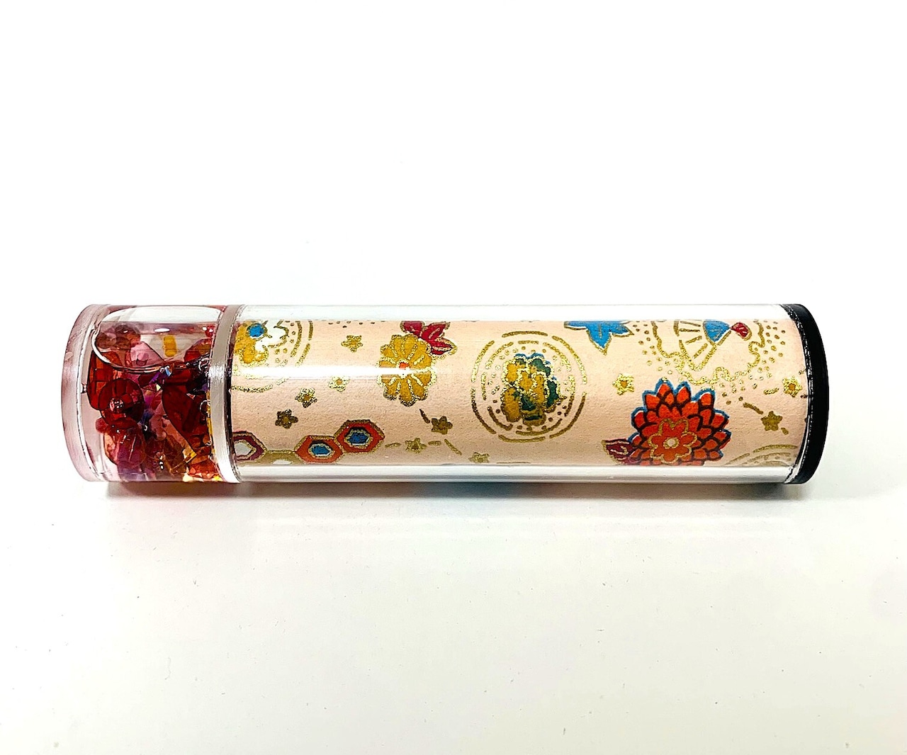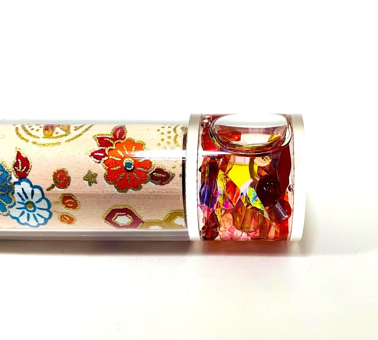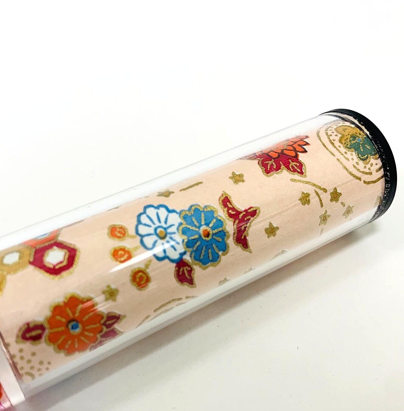 筒部分には透明なアクリル板の下にピンク地の和紙に和柄の模様が