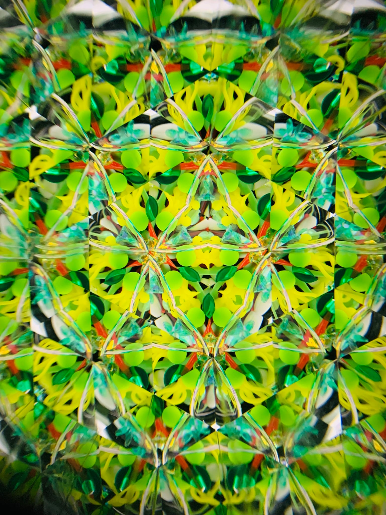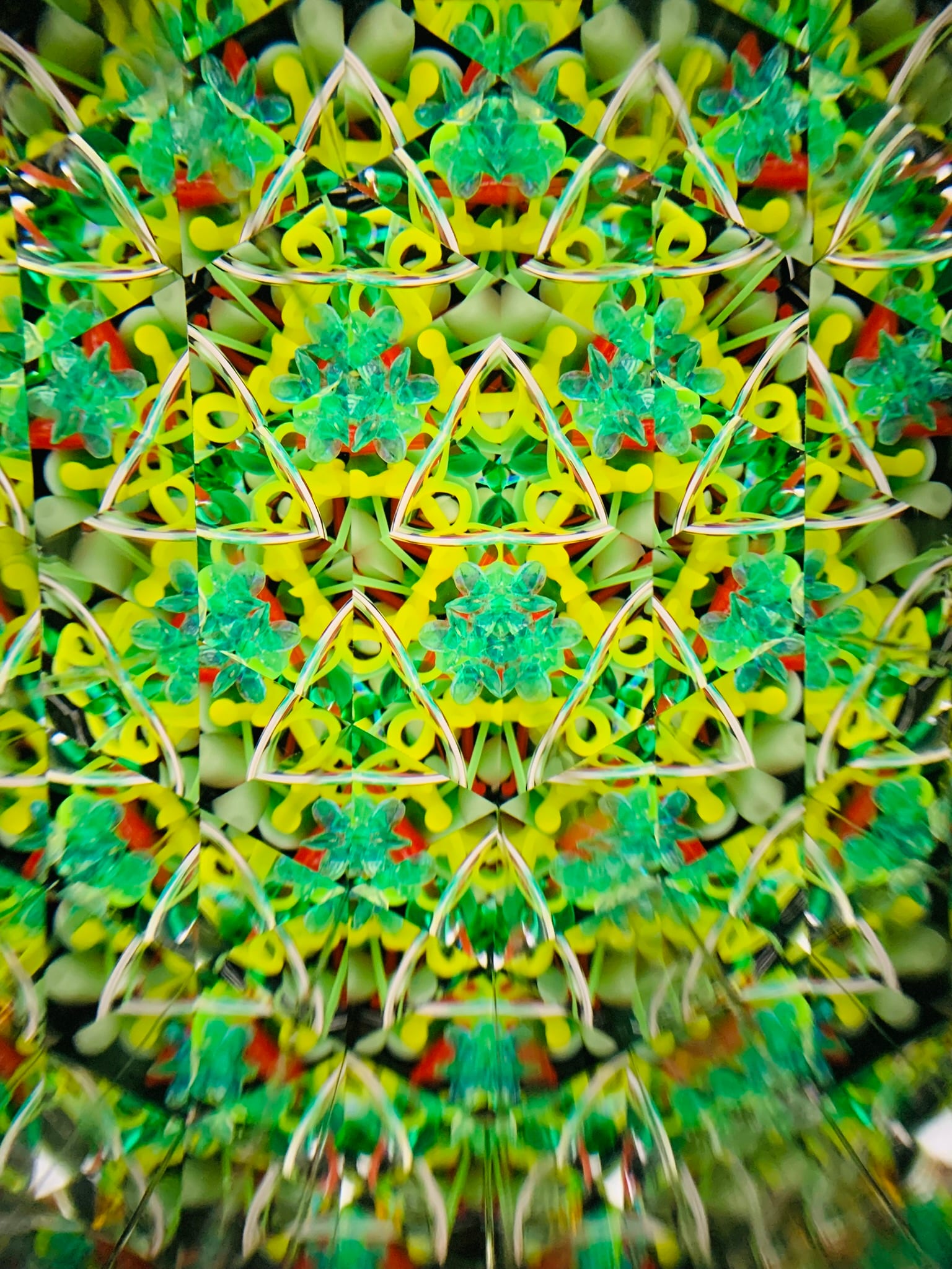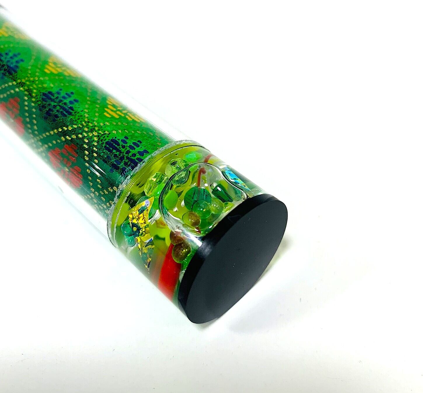 万華鏡内部も緑色のビーズが主に入り、差し色に赤色が