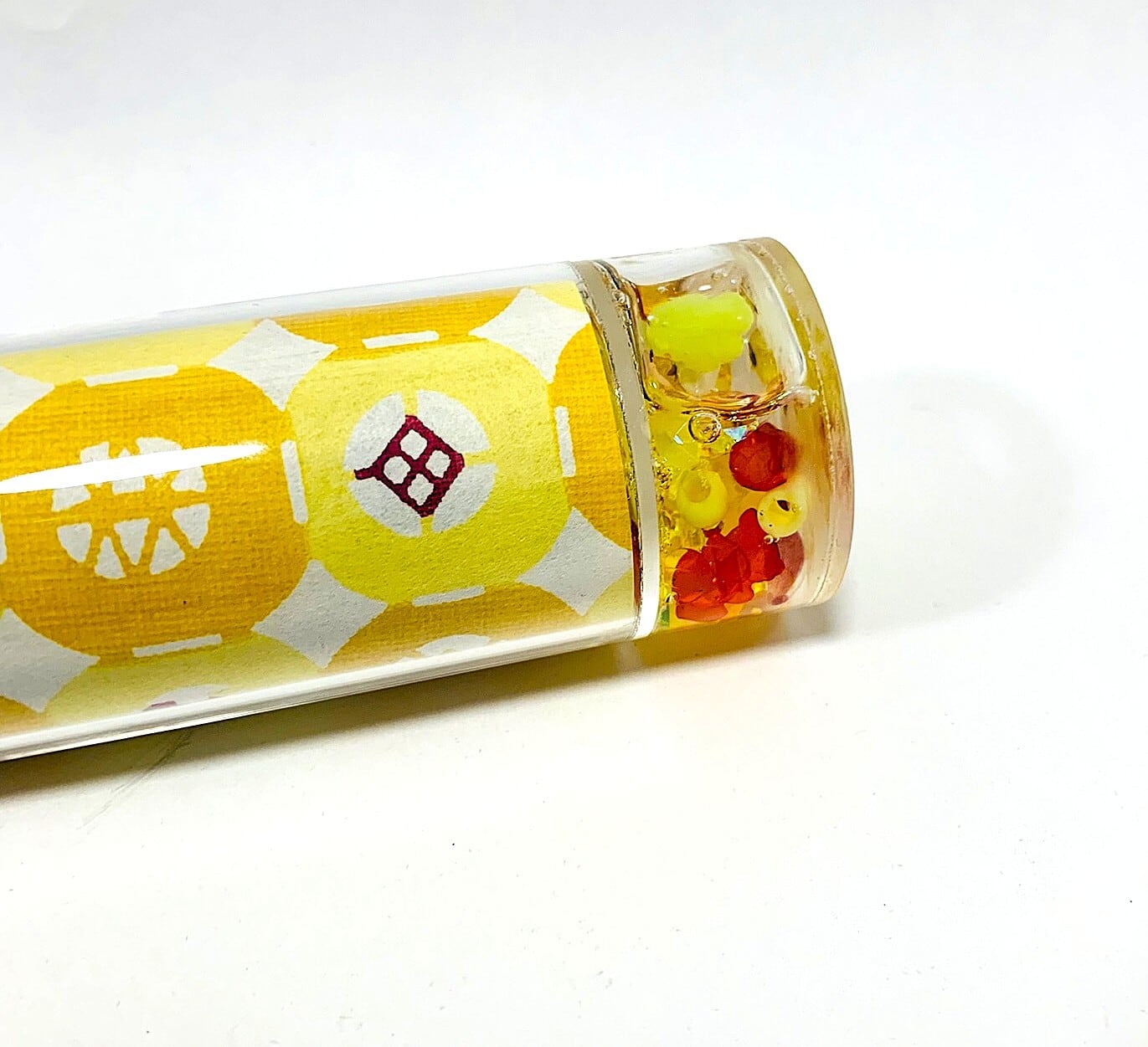 入っており、模様がキラキラと変わっていくとっても美しい万華鏡です。