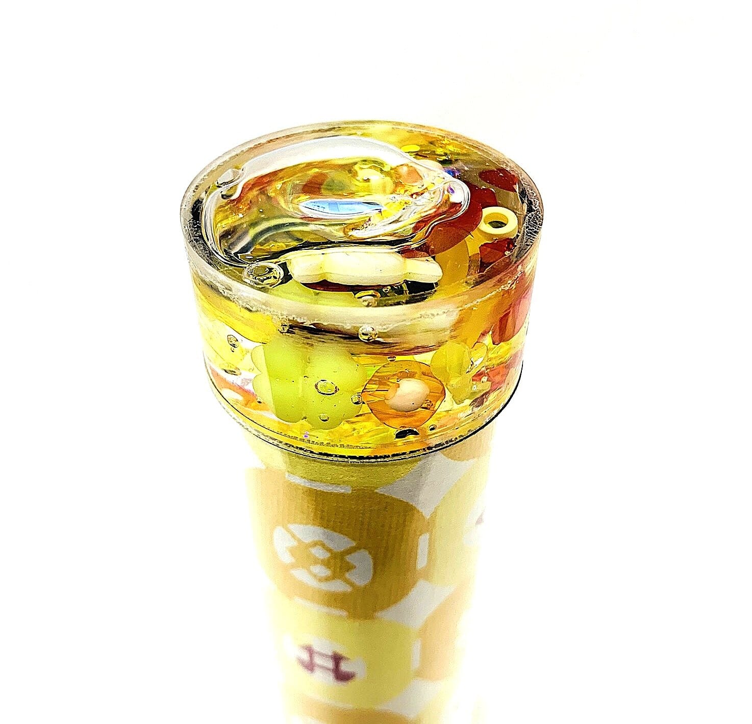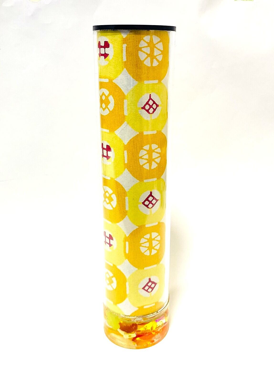 筒部分には透明なアクリル板の下に黄色を基調とした和紙が