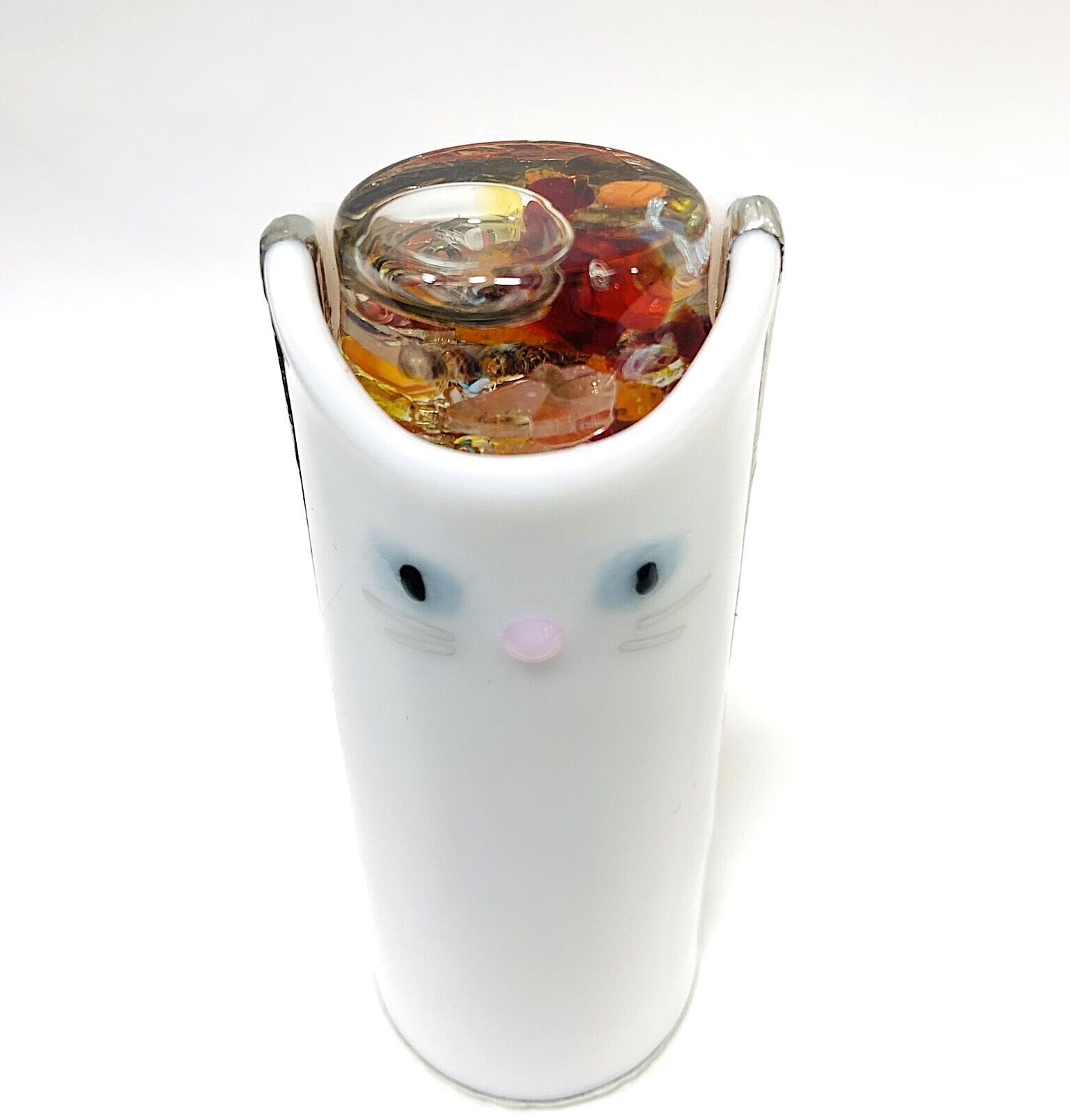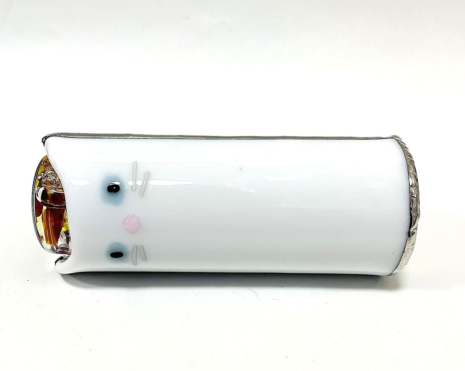 筒部分にガラスが使用され、白猫をモチーフにしかわいらしい万華鏡です。後ろにはしっぽもあります。 繊細な飾りはんだがのぞき口にあしらわれており、手に取るたびにその美しさに心を奪われます。
