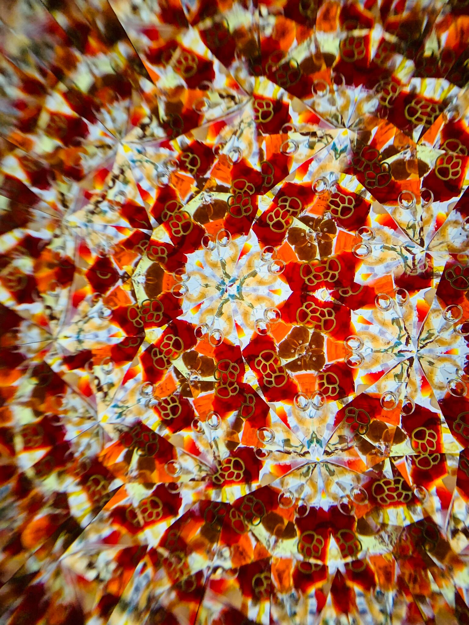 オブジェクトには、ガラスやビーズが組み合わされ、オレンジ、赤を基調とした華やかな映像が広がります。肉球のオブジェクトも入っています。オイルタイプの万華鏡ならではのゆったりとした動きが、覗くたびに新たな楽しさを提供してくれるでしょう。