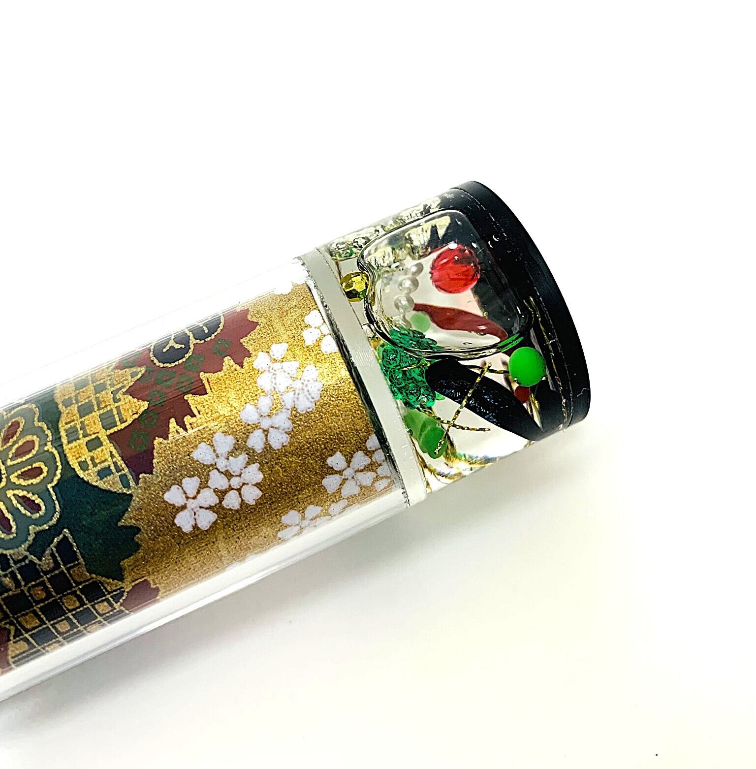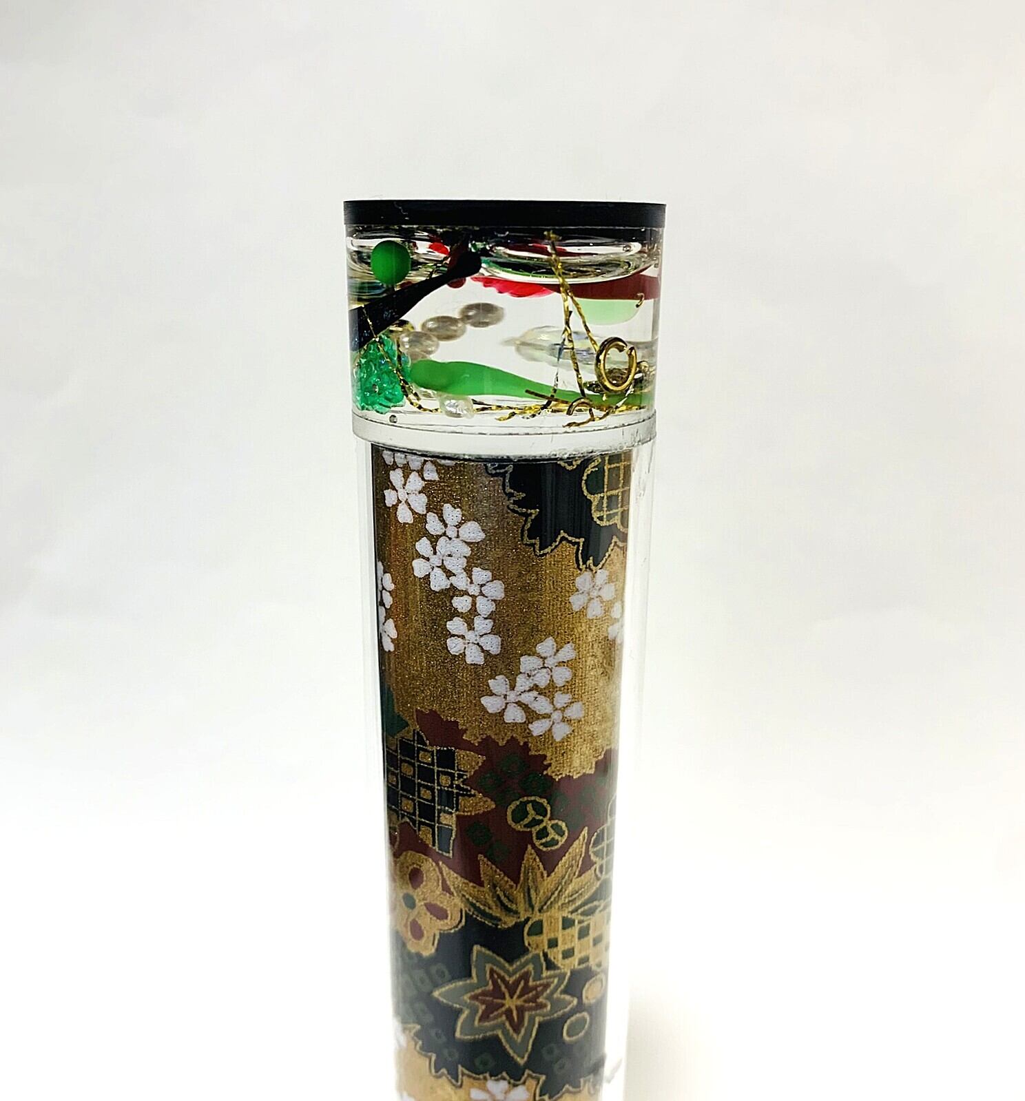 筒部分には透明なアクリル板の下に金、黒、緑を基調とした和柄の和紙が